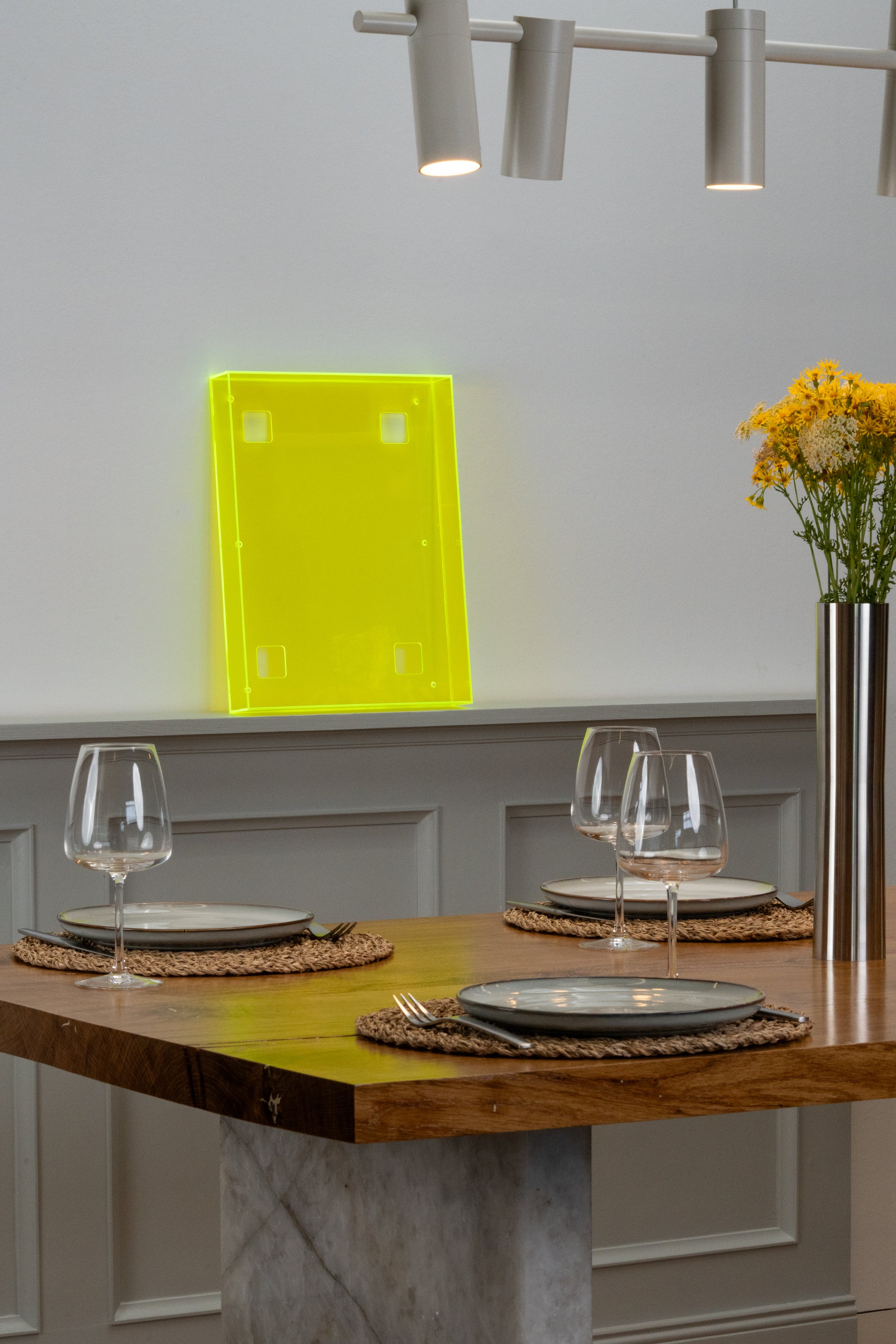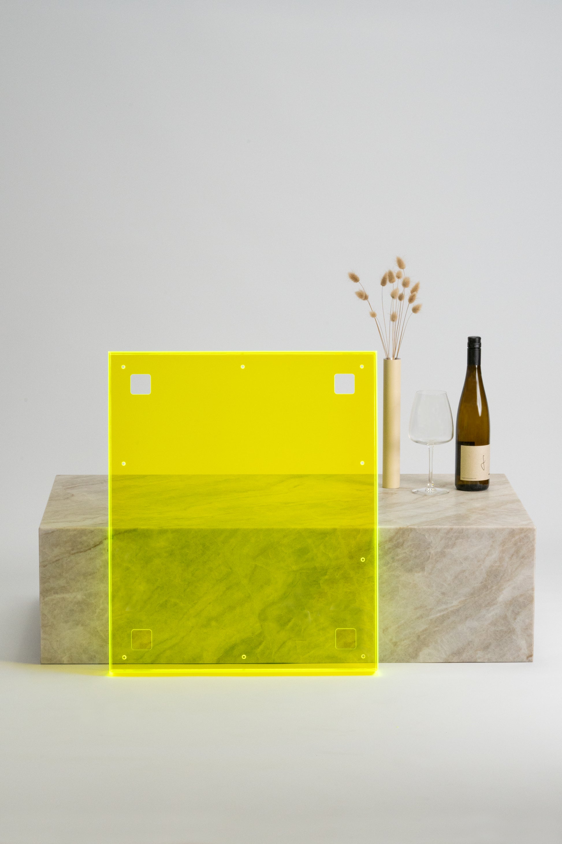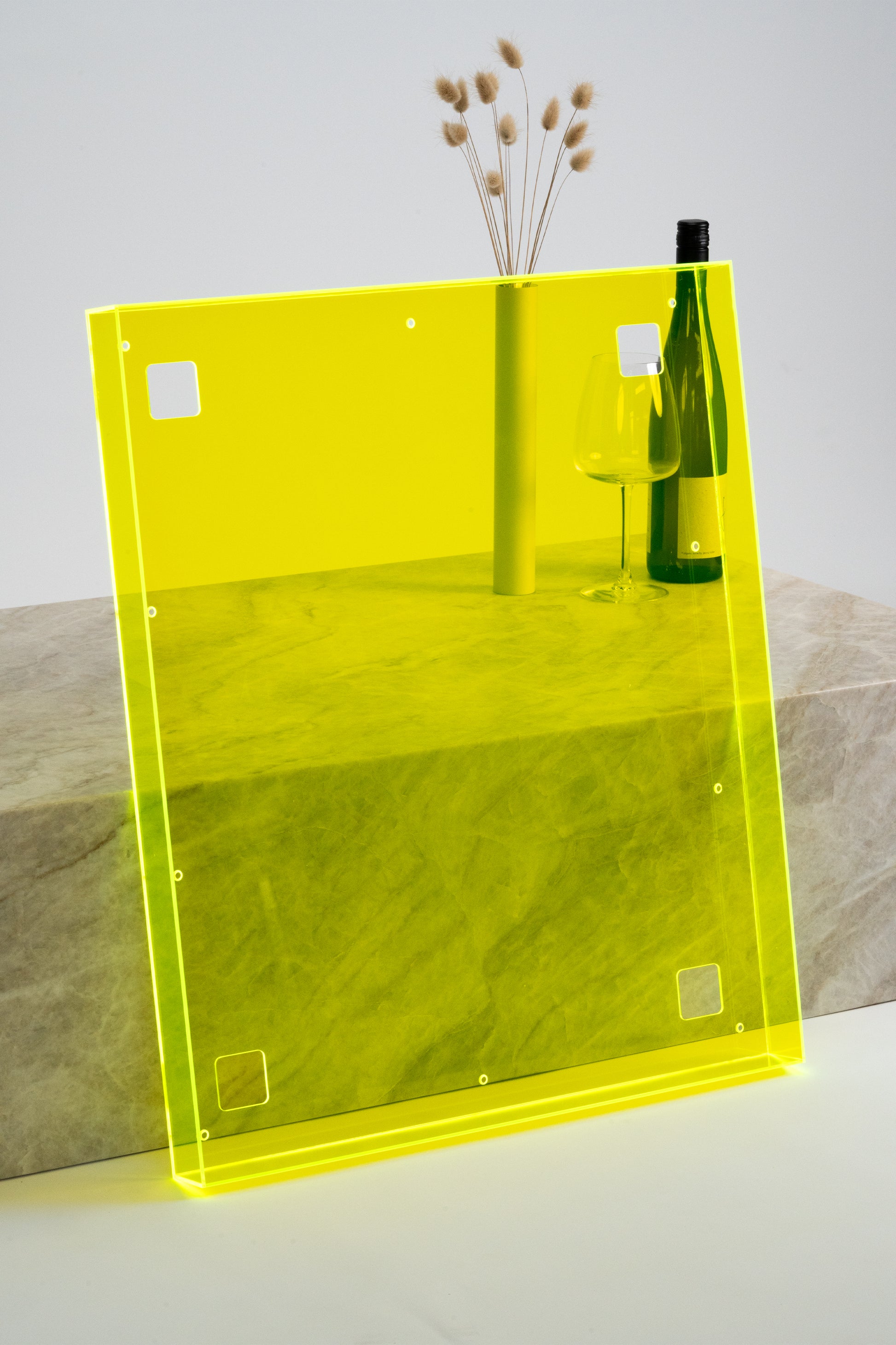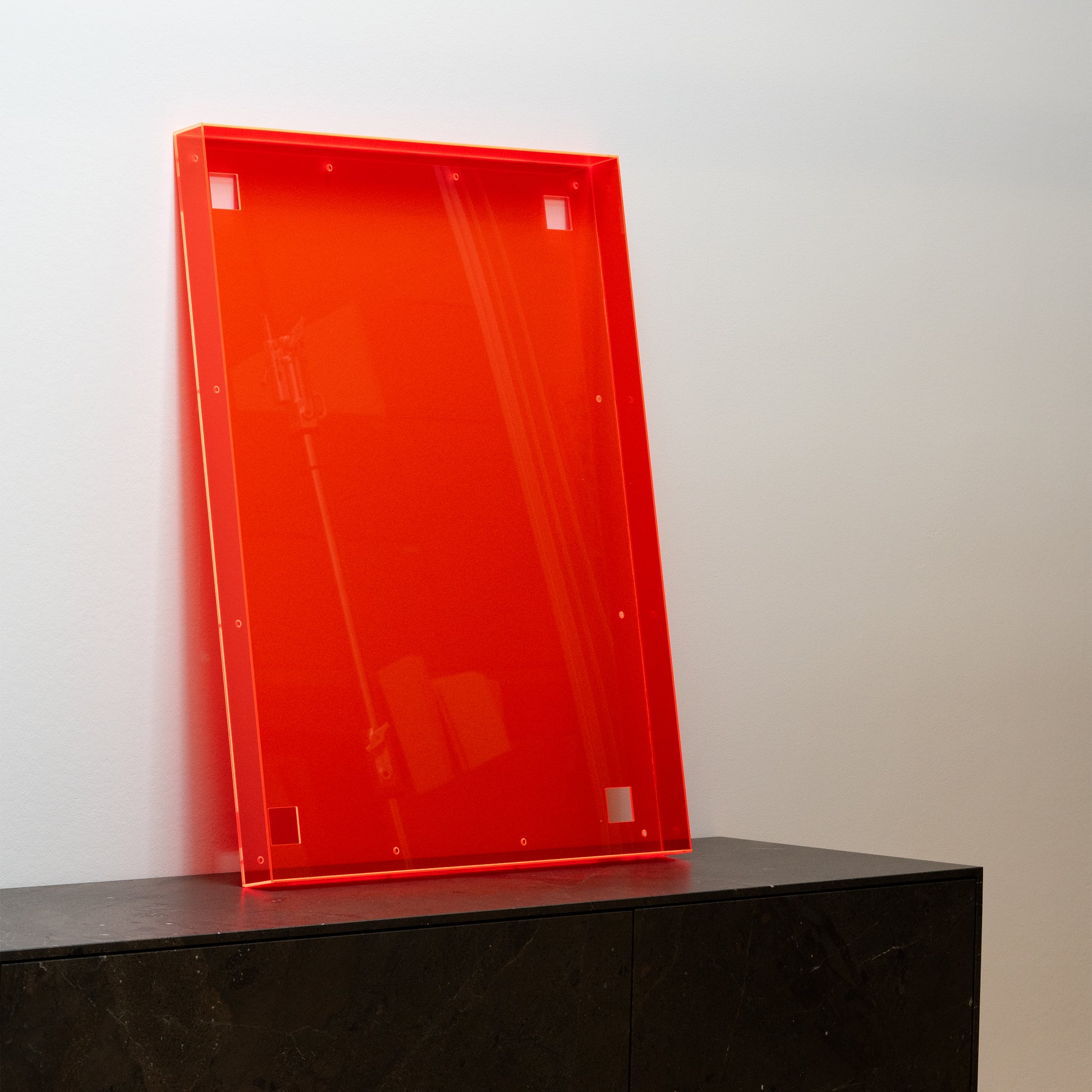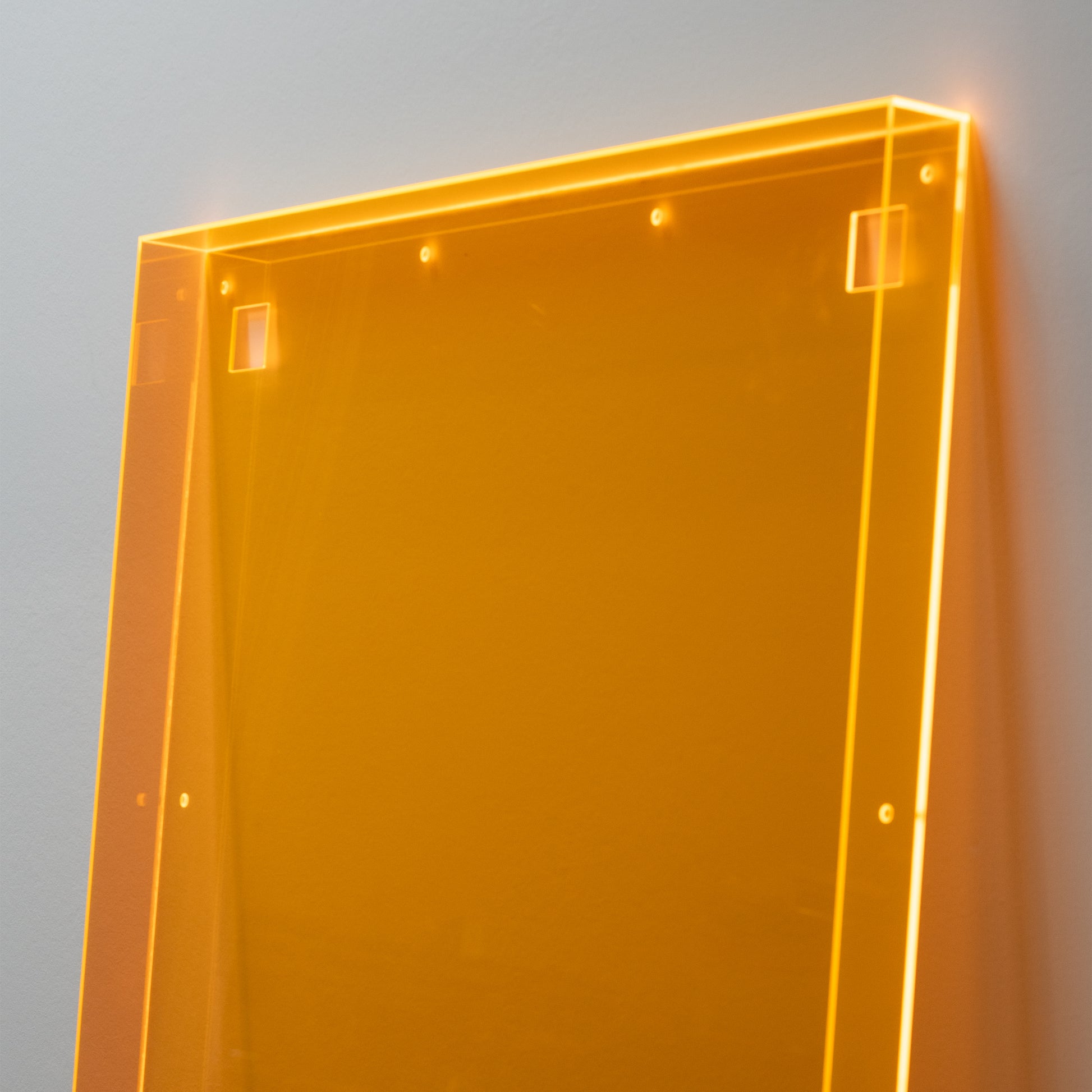 Fluorescent acrylic glass in a color of your choice. Available colors: blue, yellow, green, orange, and red.